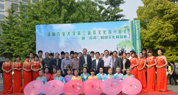 的同学们开始了精彩的演出,娇俏可人的少女们在《茶山情歌》的伴奏下,演绎了丰收采茶忙的动人场景;结合中国传统文化元素的书法、太极拳、武术、古筝以及长嘴壶茶艺表演,刚柔相济、动静结合、虚实相生,引人入胜;祭祀、宴客、拜师茶礼表演,将茶文化同中国作为礼仪之邦的礼紧密结合,古风深深,意蕴悠悠;主题茶艺表演《烟雨江南》再现宋代“执香捻茶”的场景,使观众充分感受到了茶文化在中国的源远流长;绿茶茶艺表演将演出带向高潮,茶艺队员优雅的气质,娴熟的技艺,扎实的基本功,赢得了在场嘉宾的广泛赞誉。开幕式结束后,程传兴书记寄语演职人员,他把人生比喻成茶,先苦后甜,鼓励同学们勤于专业,沏好人生的这杯茶。
