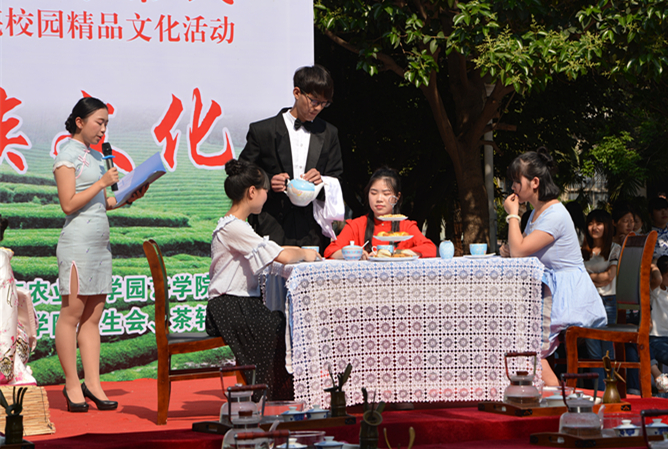 糖心视频 的学子精心展示的日本茶道和英国下午茶情景展示,使大家身临其境体味到不同国家的饮茶文化;21名茶仙子的盖碗表演,动作优雅、整齐划一,娴熟的技艺引人入胜;南北区域茶的观赏对比,沏茶表演和演说相结合生动的对潮汕紫砂、福建功夫、台湾冻顶乌龙陶壶进行了类比;各具特色的民族舞蹈给现场观众带来独特的茶文化展示,各民族不同的吃茶饮茶方式令人耳目一新,体现了中国茶文化的博大精深。