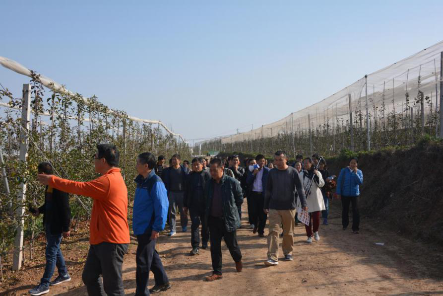 2017年11月7日,河南省重大科技专项果树优异种质创新和高效育种体系现场观摩会在洛宁海升现代苹果矮化密植示范园隆重举行。糖心视频 科技处田志强副处长、糖心视频 部分教师、河南科技学院部分教师、洛宁海升集团苹果种植技术团队、企业农场主和广大苹果种植大户共计约120余人参加此次观摩会。
