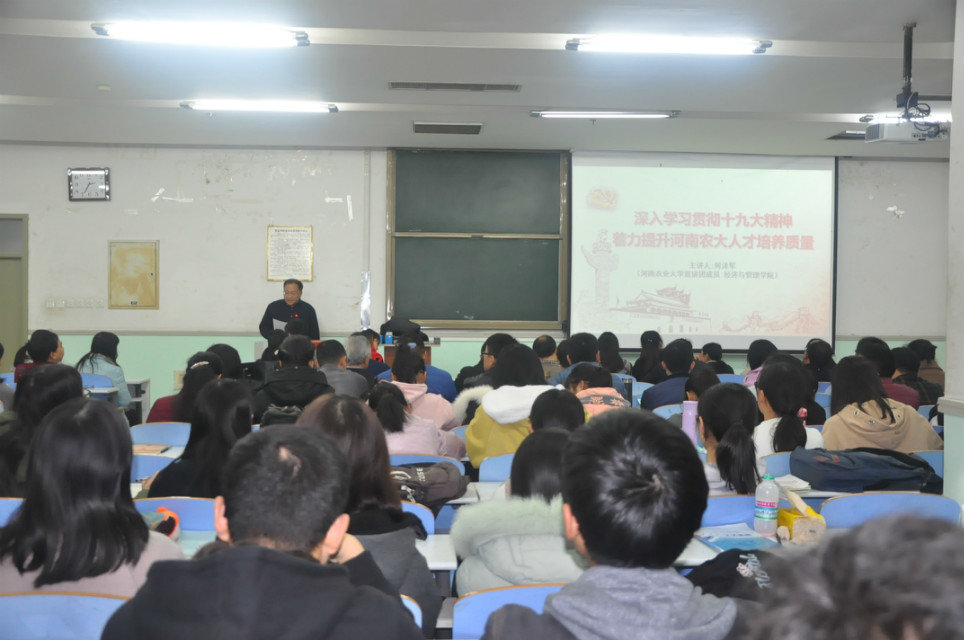 宣讲团成员、经济与管理学院副院长何泽军以“深入学习贯彻十九大精神,着力提升河南农大人才培养质量”为主题开展宣讲。院党委书记耿超明主持宣讲会,我院全体教工及学生代表参加此次宣讲会。