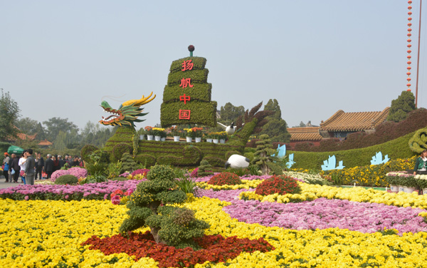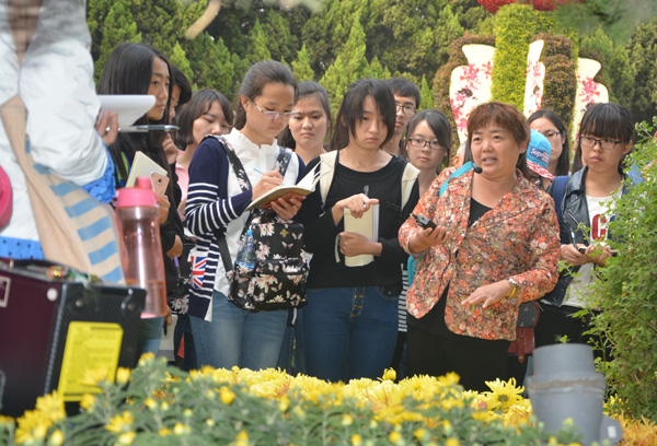 “耐寒唯有东篱菊,金粟初开晓更清”“世情儿女无高韵,只看重阳一日花”,恰逢重阳佳节,我院2013级园艺专业4个班100余名学生,在武荣花等老师的带领下,赶赴开封,参加中国开封第33届菊花文化节,进行本届卓越园艺师《花卉栽培学》专业课程教学实习。整个实习过程分两个阶段,上午在龙亭公园参观大型菊花展,学习菊花品种分类、繁殖方法、栽培管理、嫁接以及造型技术,下午到中国翰园碑林学习菊花插花知识,两个阶段分别由郝凤和武荣花两位老师主讲。