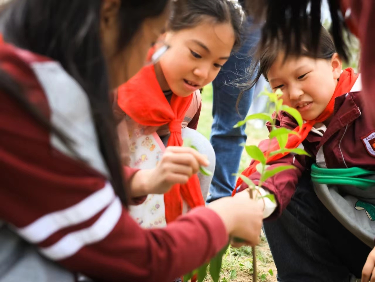 果树系的老师带领着,在百果园里学习给果树抹芽。小学生们紧紧围绕在自己的“学习导师”身边,很快就对这片园地熟悉起来。他们或者认真观察,或者动手实践,或者问着各种各样的问题。“导师们”也耐心地向小学生展示、指导和解答。