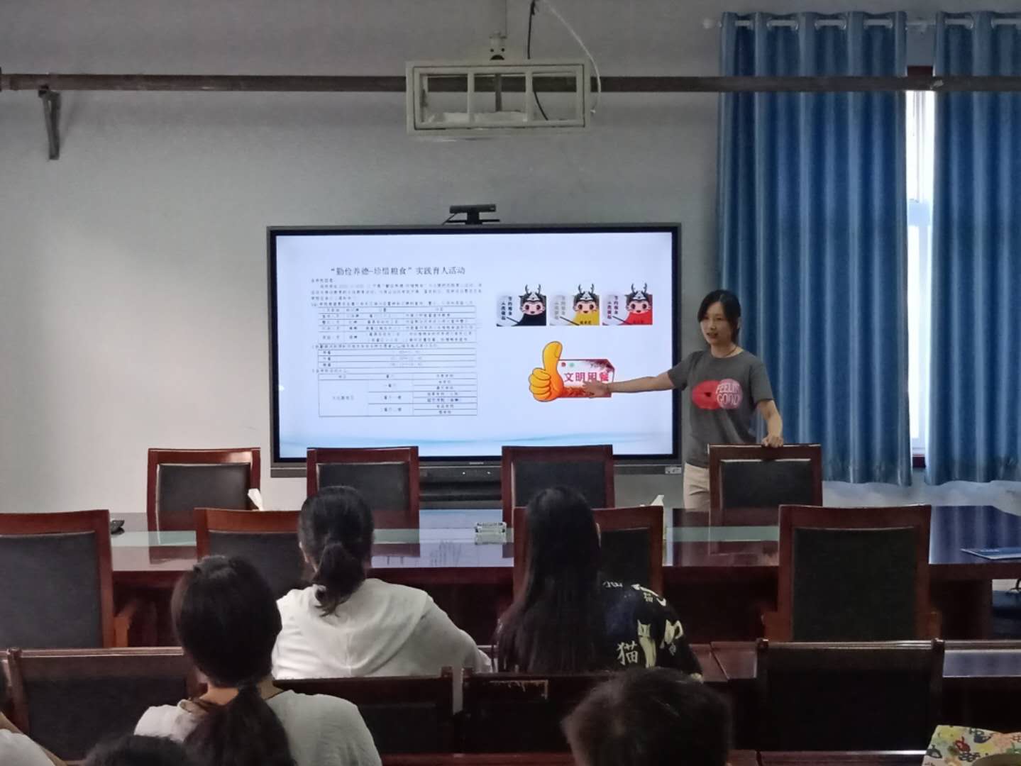 首先,陈老师结合播放观看的视频,就校团委组织开展的“勤俭养德 珍惜粮食”主题教育活动进行了说明动员,倡导大家养成良好的生活习惯,树立勤俭节约意识,强调了“厉行节约,反对浪费”的重要性,并鼓励同学们积极参与到主题教育活动的志愿服务中来,通过广泛的参与,用自己的实际行动,践行节约粮食,文明用餐好风尚。