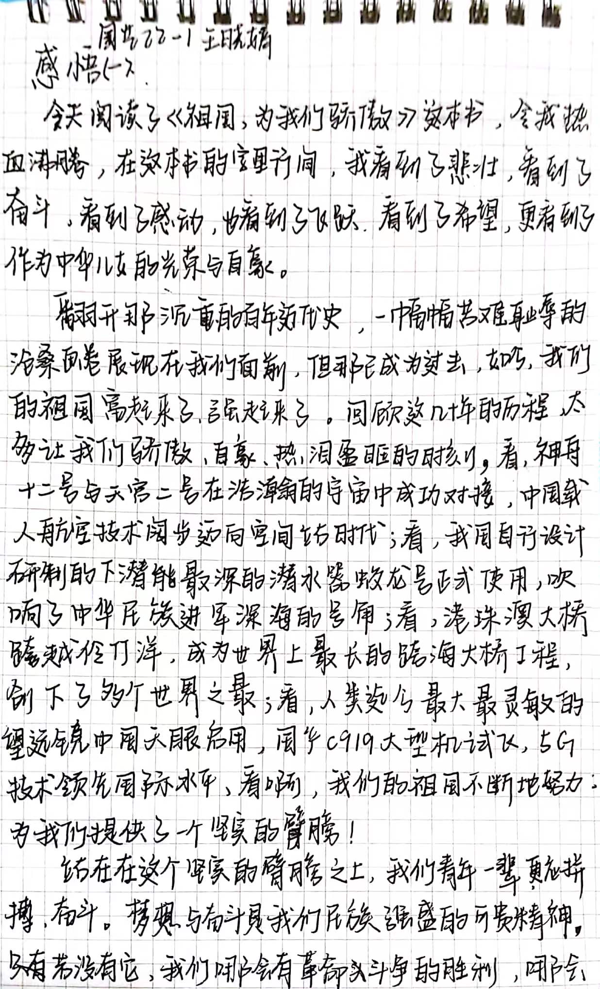 同学们通过读书加深自身底蕴、提高自身修养,感受文字的魅力,联动历史的音符、奏响时代的华丽乐章。翻开沉重的百年近代史,大家从中体会到了奋斗的可贵。同学们从清华学子的真切话语中收获颇丰,不禁握住手中之笔,写下心中之念:“家不仅是我们物质文化的根本,也是精神文化的摇篮”、“这些都是一种积极的思想,这些才是艺术真正应该担当的使命”等。一笔一划都书写着同学们的壮志与理想,诉说着青年学子对国家、对学校的热爱与自豪。