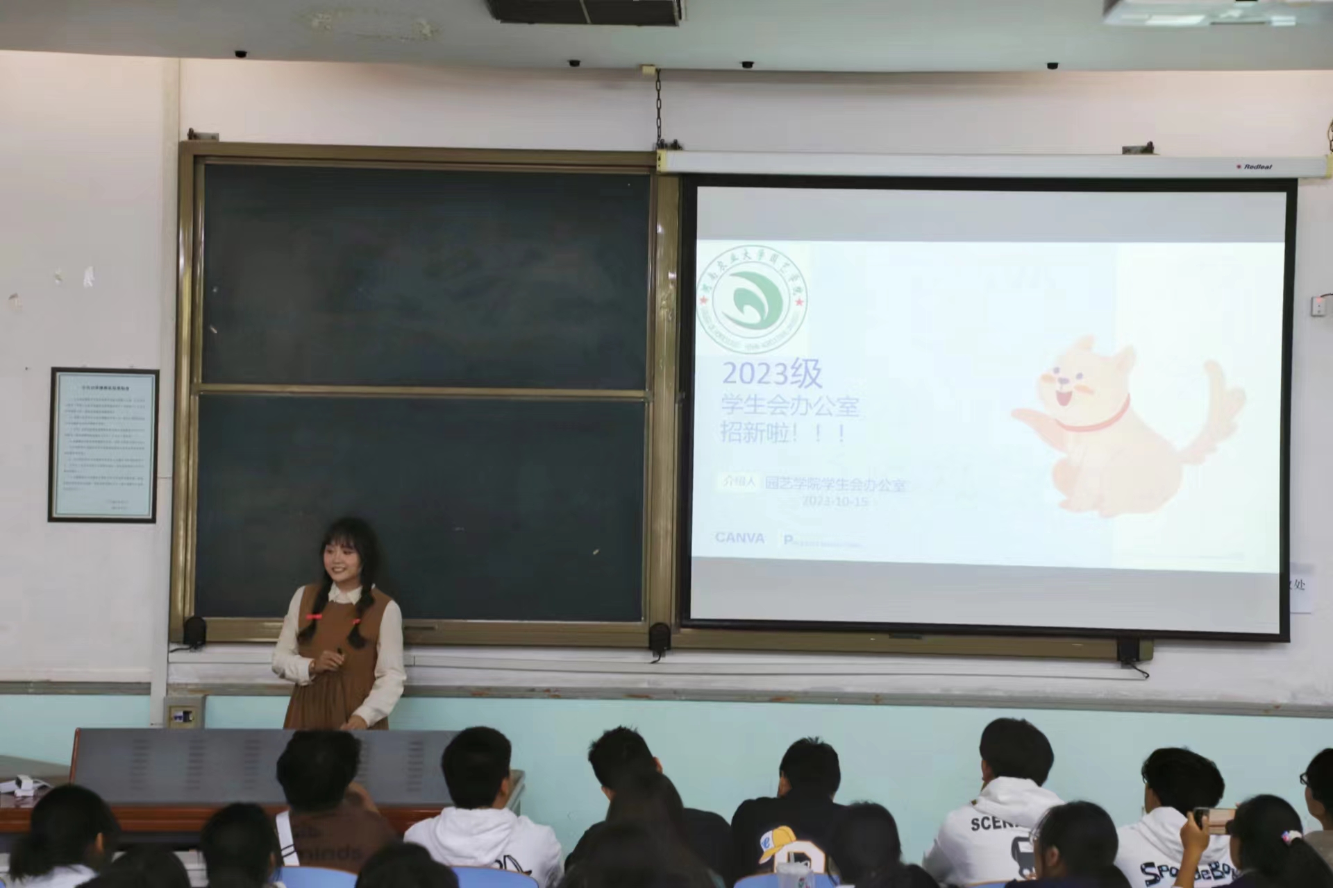 活动伊始,主持人代表各学生组织向2023级新生的到来表示了热烈的欢迎。随后,各学生组织的宣讲人分别从部门介绍、职务讲解、成员介绍、报名方式等板块展示了社团的方方面面,幽默的讲解方式和颇具趣味的PPT及视频为各部门起到了极佳的宣传作用,在宣讲过程中同学们所展现的为了部门更好的发展而努力的决心和信心感染了23级的同学们,使他们想加入学生组织的热情达到了高潮。院团委、新媒体、院学生会、艺术团、志愿者协会、茶轩社、花语社分别宣讲完毕后,宣讲人共同表达了对各位新同学的欢迎,希望同学们积极报名参加社团,丰富充实自己的大学生活。
