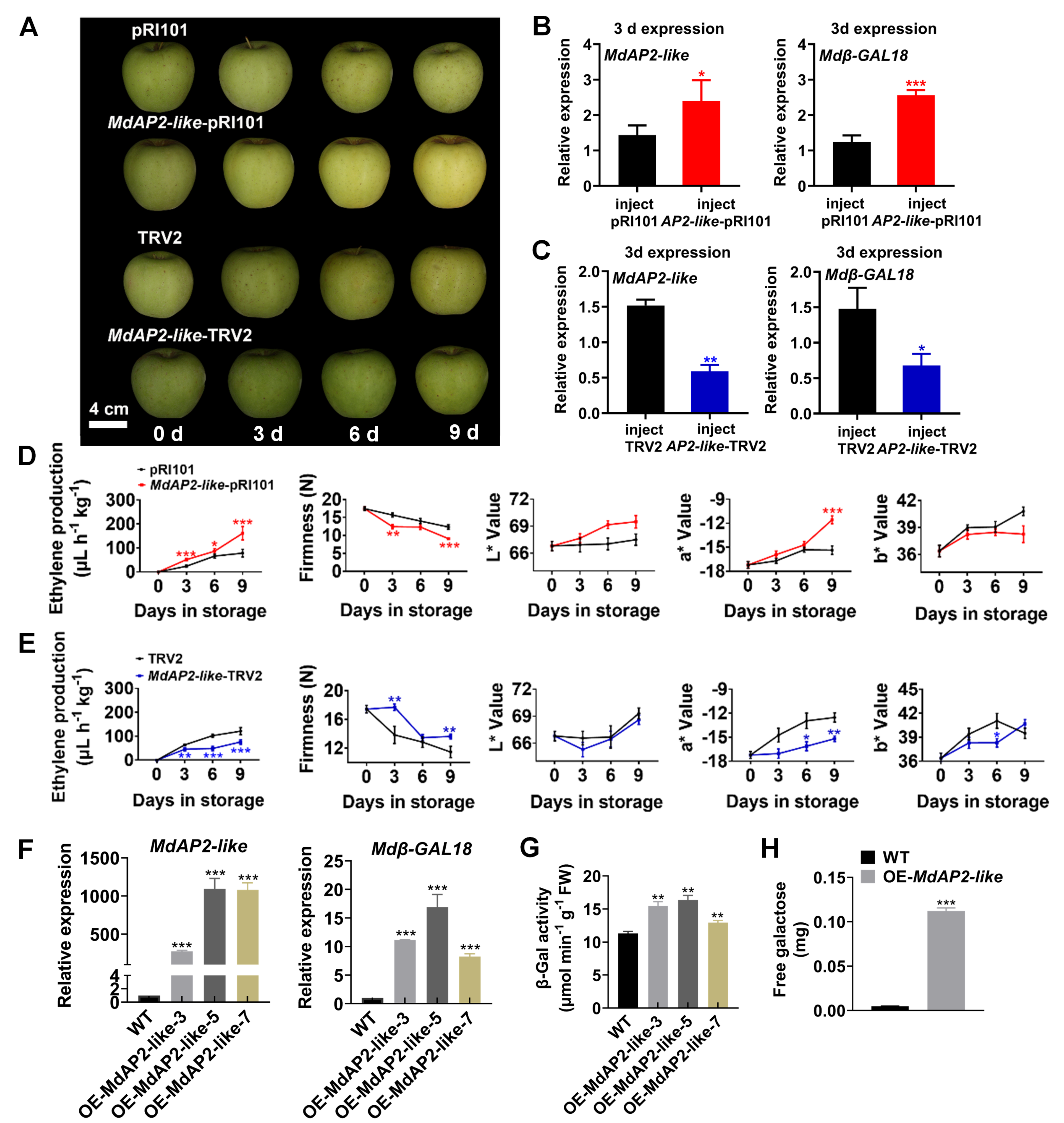 该研究团队基于转录组测序筛选到一个苹果果实软化调控的候选转录因子MdAP2-like。通过苹果果实瞬时表达技术研究发现,过表达或沉默MdAP2-like基因能够促进或延缓果实硬度的下降和果实软化的发生;通过苹果愈伤转基因研究发现,过表达MdAP2-like能够显著提高果胶降解相关β-半乳糖苷酶(β-Gal)的活性和游离半乳糖的含量,且过表达MdAP2-like能够显著诱导Mdβ-GAL18基因的表达(图1)。