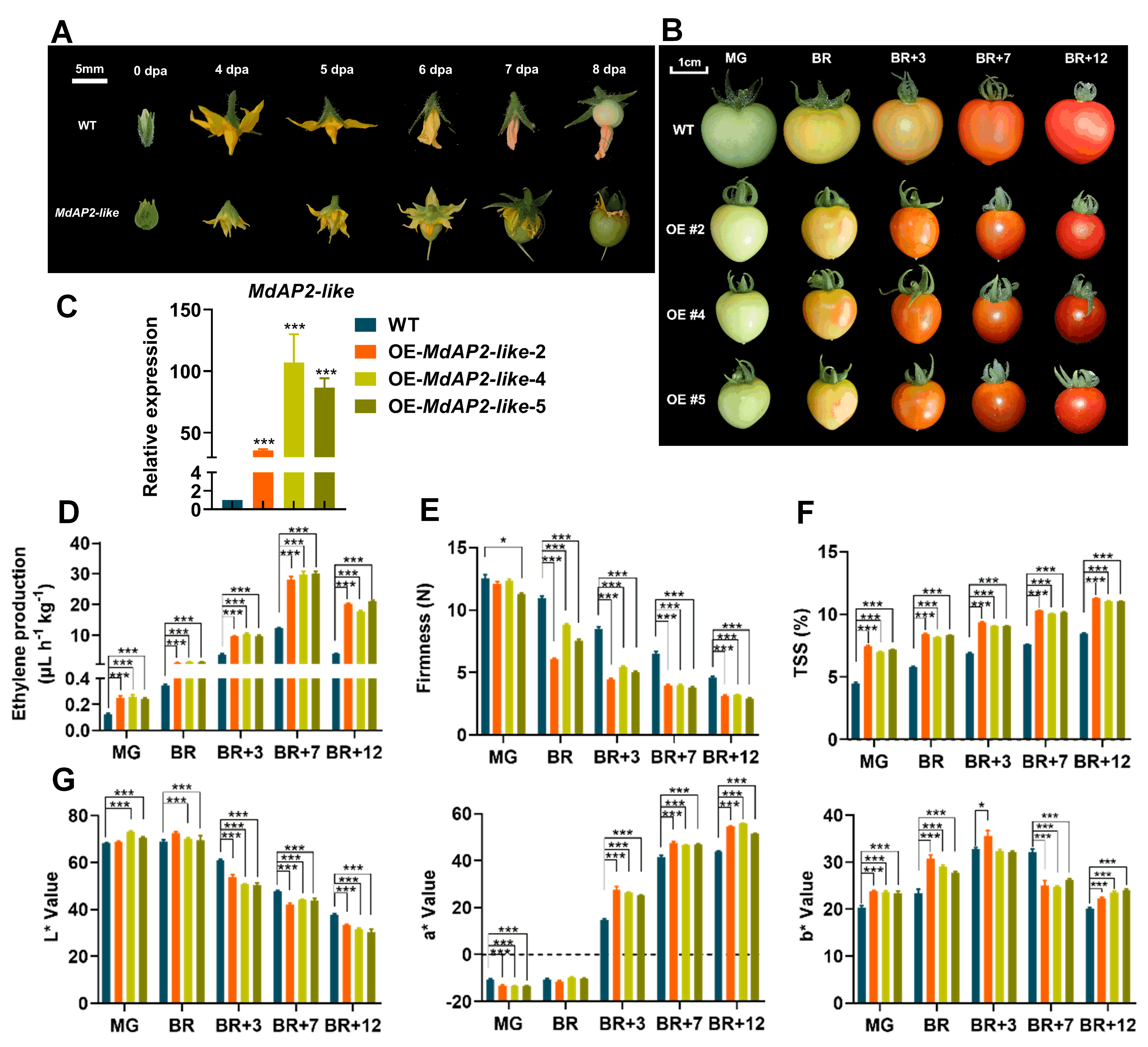 进一步,作者通过番茄转基因发现,过表达MdAP2-like促进了番茄果实的成熟软化,并使果实果个变小(图2)。MdAP2-like这一具有调控果实软化和果实大小双功能的转录因子的发现,为选育耐贮运的大果型苹果新品种提供了宝贵的基因资源,研究结果有利于果园提质增效,减少苹果采后损耗,助推苹果产业高质量发展。