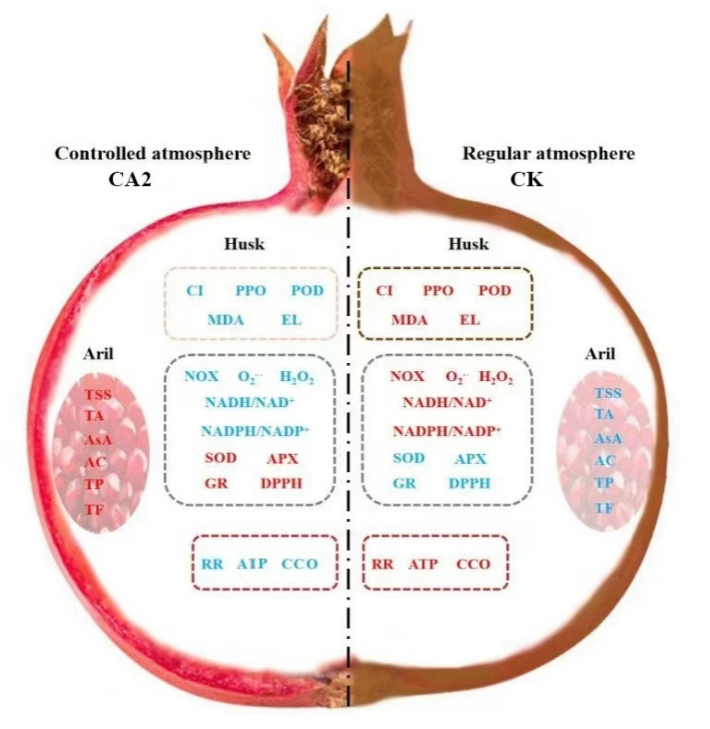 2 (CA2) 两种低温气调贮藏,常规空气为对照,探究鲜食石榴保鲜的营养指标、外观品质、和生理生化变化,通过能量代谢、呼吸速率、ROS清除能力等方面解析了较高的二氧化碳条件(CA2)可以有效降低石榴果实的营养损耗,如,花青素、总黄酮、维生素C等含量,并延长石榴的贮藏期。