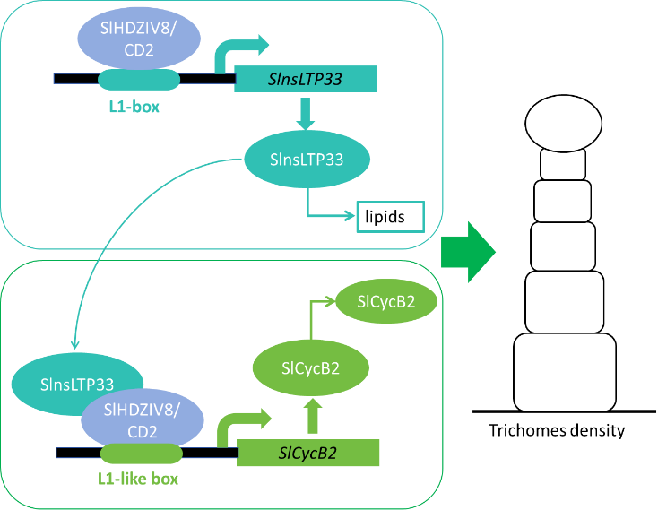 SlnsLTP33基因过表达番茄植株表皮毛密度增加,而敲除和共抑制突变体则减少,证实了其在表皮毛发育中的功能。深入机制研究表明,SlnsLTP33蛋白能与SlHDZIV8或CUTIN DEFICIENT2(CD2)形成复合体,协同转录激活细胞周期关键因子
