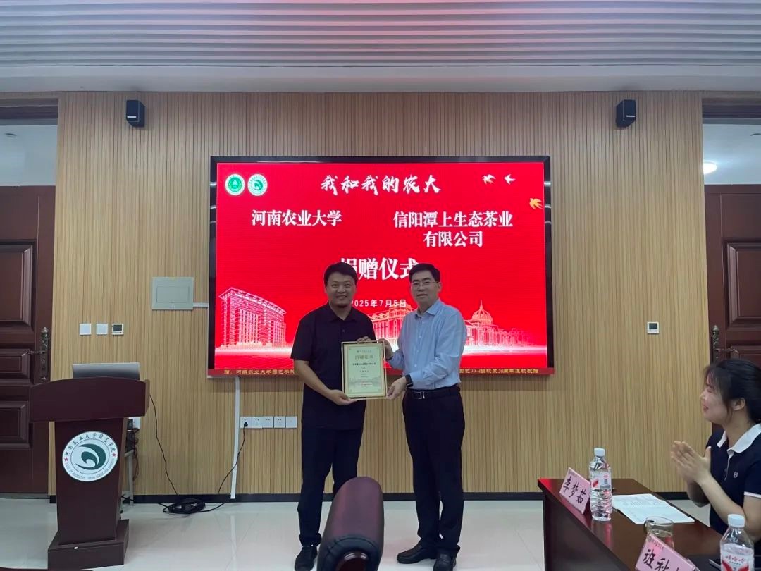 在信阳潭上生态茶业有限公司捐赠仪式上,郭战伟首先代表学校对李亚磊校友一行和各位校友荣归母校表示热烈欢迎和衷心感谢,并简要介绍了学校的最新发展成就。他高度赞扬了李亚磊校友心系乡土、投身乡村振兴的善举,指出其行动与我校“明德自强,求是力行”的育人理念高度契合。郭战伟强调,此次捐赠必将激励更多学子关注茶产业,为服务乡村振兴与产业升级贡献智慧和力量。李亚磊校友深情回顾了母校对其创业征程的坚实支持,表示躬耕田园、根植中原正是对母校精神的践行,作为农大人,响应国家号召、助力河南茶产业焕发新光是应有的担当。随后,郭战伟代表学校接受捐赠,并向李亚磊颁发捐赠证书及纪念校徽。