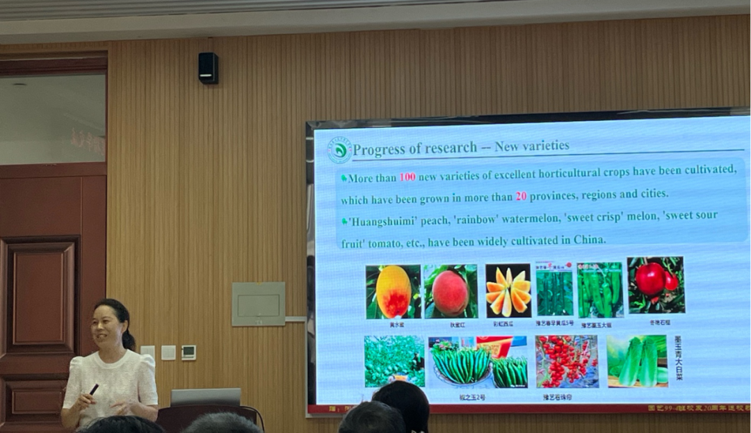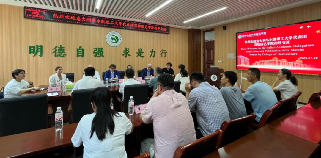 领导班子成员、各系及平台负责人参会。院长郑先波首先对意方代表的到来表示热烈欢迎,并逐一介绍了中方与会人员。叶霞教授向意方介绍了学院的情况,从发展历程、办学规模、学科专业布局、科研团队架构、核心研究方向等方面展开,重点展示了学院在园艺作物新品种培育领域的成果-已成功培育 100 余个优良品种,推广至全国 20 余个省市,其中 “黄水蜜” 桃、“彩虹” 西瓜等特色品种在国内广泛种植,彰显了学科科研实力与应用价值。
