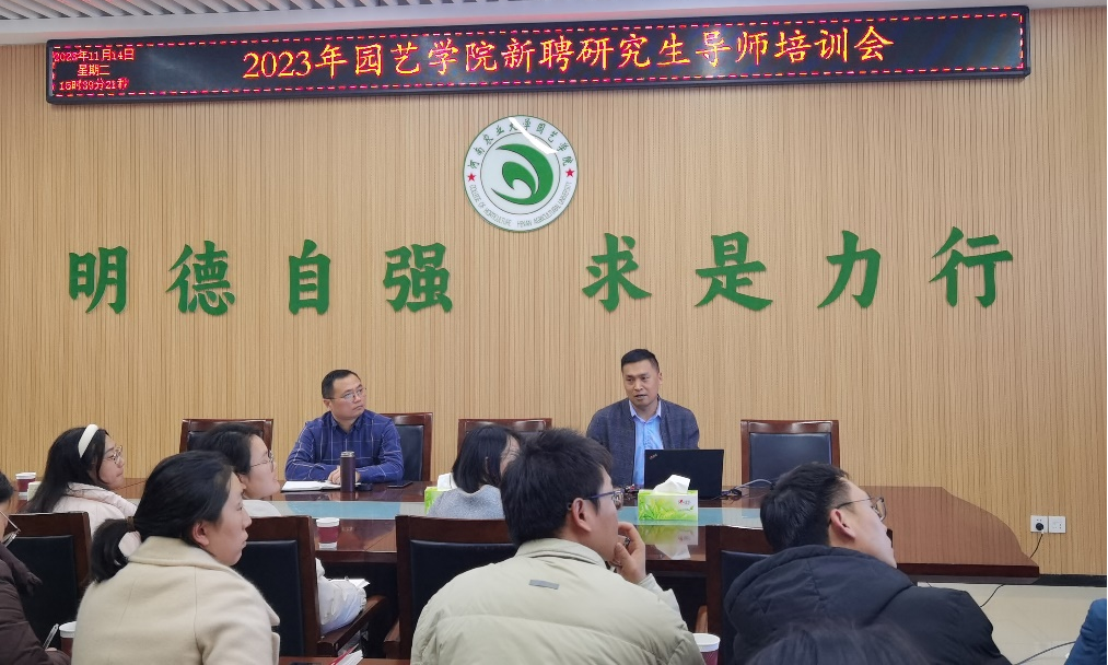 为了响应学校“双一流”创建的号召,贯彻创新人才培养理念,提升导师教书育人能力,11月14日下午,学院在力行楼北215会议室举办新聘研究生导师培训会,培训会主讲教师为副院长胡建斌教授和科研秘书白团辉教授。此次培训会的主题为园艺学科及学位点介绍、科研项目的申报与结题。全院2022年、2023年新聘任研究生导师参加了会议。