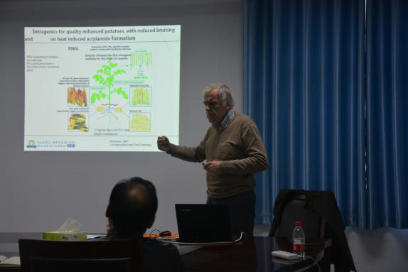 邀请,在文化路校区2号楼4楼学术报告厅为我院师生做了关于植物育种的学术报告。报告由蔬菜系孙凯乐老师主持,孙守如副院长,孙治强教授,闫滋福教授,杨路明教授,郑州蔬菜所科研人员以及我院部分青年教师和研究生参加了此次报告会。Evert Jacobsen教授向大家分别介绍了马铃薯的传统育种,基因组测序辅助育种,以及突变育种三方面内容。其中着重讲解了突变育种在马铃薯品质及抗病育种中的应用。Evert Jacobsen教授的报告既生动又精彩,赢得了与会师生的阵阵掌声。报告结束后,Evert Jacobsen教授与部分老师与研究生就同源转基因的社会认可度等问题进行了深入的讨论与交流,同时对大家提出的问题给予了耐心细致的解答。