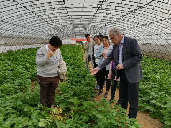 科研基地和毛庄绿源的实验基地。期间,Evert教授耐心的向研究生介绍了马铃薯的各种病害及防治方法,同时对当地适宜种植的马铃薯品种提出了相关建议。(文/孙凯乐)