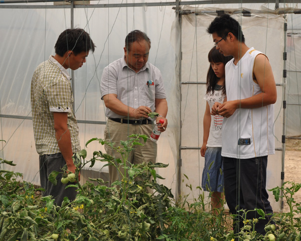 6月5日,耿超明书记一行驱车抵达我院驻马店教学实习基地—河南鑫芳生态农业发展有限公司的蔬菜设施栽培基地。在该公司杨鑫芳董事长的陪同下查看了西红柿、黄瓜、甜瓜、茄子等大棚作物的生长和收益情况,孙治强教授现场给实习学生讲解了西红柿蕨叶型病毒病、黄瓜霜霉病、白粉病等病害的识别与防治方法,以及茄子的疏枝、摘叶和水肥管理等生产管理技术。