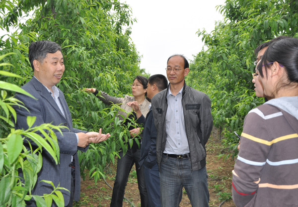 院长冯建灿教授首先询问了同学们在基地的学习和工作情况,了解每个学生所从事的具体工作和取得的进步,并对如何进行实习、如何做好实习,如何让实习取得更大成绩进行了指导,冯院长指出,卓越园艺师培养生产实习,不仅仅只学习园艺作物栽培、生理和病虫害防治等专业技术方面的知识,还要学习果园管理和经营以及与人交流等方方面面的才能和技巧,全面锻炼和提高自己的各种技能。要通过实习,将自己实际操作所得到的第一手材料和别人说的结果以及书本中所学到的知识三者进行比较,找出差异,分析原因,找到答案。在虎牢关,冯院长要求正在埋头苦干的同学们要多观察,多思考,多向身边的人学习,要对未来有所思考,做好长远规划,制定长期目标,长期目标的确定决定着目前应该做什么和应该怎么做,卓越园艺师培养志在培养“三家”(科学家、企业家和政治家)的基本素养,不管你将来干什么,梦想会为努力指明方向。冯院长还以学生正在做的赤霉素(简称GA)抹芽为例,教导学生在生产实习过程中要多问几个为什么,为什么要抹GA,GA的种类和作用原理是什么,在梨上的作用效果和在桃上的作用效果有什么不同等等,这些知识在课堂中可能没有或者说没学会,也许学习的不够全面,没掌握牢固,但通过这次的亲手操作,就可以彻底弄清楚,并且会终身难忘。
