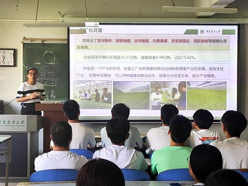在本次讲座中,李胜利主要从两方面来让学生了解现代设施农业科学与工程。在对我省蔬菜产业基本情况的讲解中,李胜利介绍了河南省蔬菜种植面积和年蔬菜产量,让学生了解蔬菜对于河南的重要性。为学生讲述了提高蔬菜产量的方法,如工厂化育苗、人工温室、典型高效种植模式等。他还介绍了农业园区未来发展趋势,及数字化的仪器设备在未来农业发展中的重要作用。最后结合“二十大”提出的现代农业强国建设,详解说明了设施蔬菜生产的新质生产力,其中包括农业经济、未来农业场景的特色化、绿色化、工程化、品牌化产业发展的趋势等。