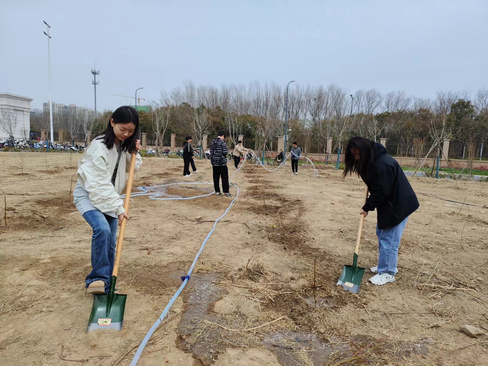 第七期青马班成员在龙子湖校区北门百果园集合,开展果园浇灌活动。
