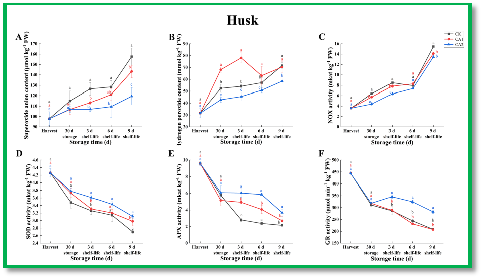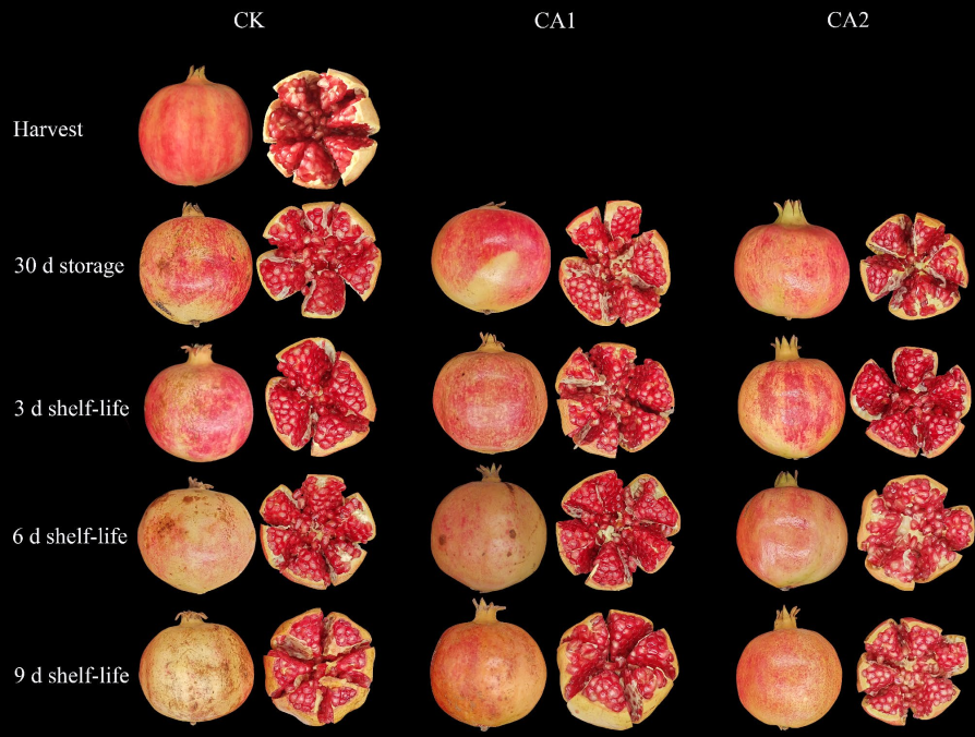 2 (CA2) 两种低温气调贮藏,常规空气为对照,探究鲜食石榴保鲜的营养指标、外观品质、和生理生化变化,通过能量代谢、呼吸速率、ROS清除能力等方面解析了较高的二氧化碳条件(CA2)可以有效降低石榴果实的营养损耗,如,花青素、总黄酮、维生素C等含量,并延长石榴的贮藏期。