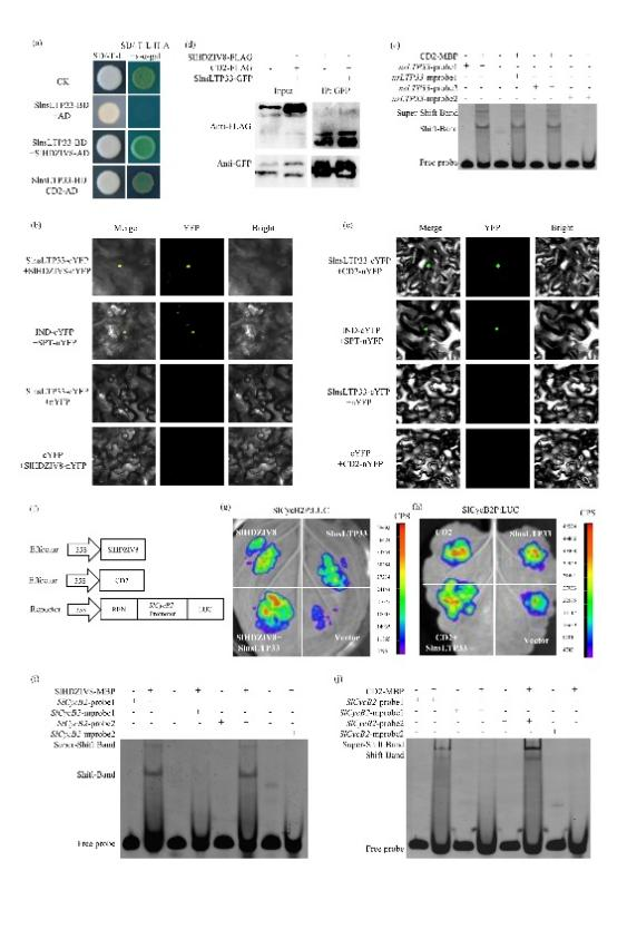 SlnsLTP33基因过表达番茄植株表皮毛密度增加,而敲除和共抑制突变体则减少,证实了其在表皮毛发育中的功能。深入机制研究表明,SlnsLTP33蛋白能与SlHDZIV8或CUTIN DEFICIENT2(CD2)形成复合体,协同转录激活细胞周期关键因子
