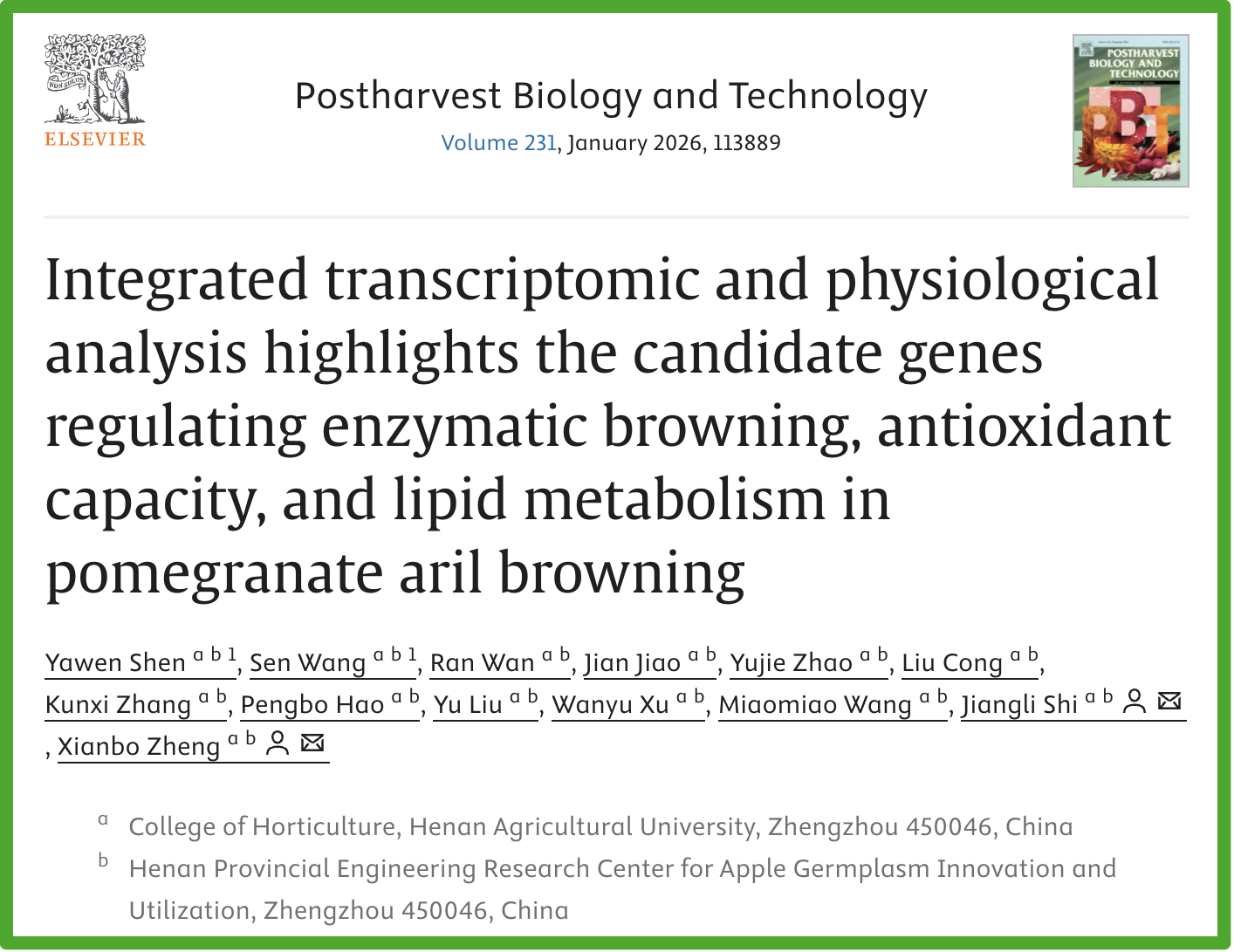 Postharvest Biology and Technology(最新影响因子6.8)。发表研究论文“Integrated transcriptomic and physiological analysis highlights the candidate genes regulating enzymatic browning, antioxidant capacity, and lipid metabolism in pomegranate aril browning”。鲜食石榴籽粒冷藏过程中易发生籽粒褐变,导致外观品质、营养价值下降、商品寿命缩短,严重影响了石榴产业发展,但其分子调控机制仍不清楚。