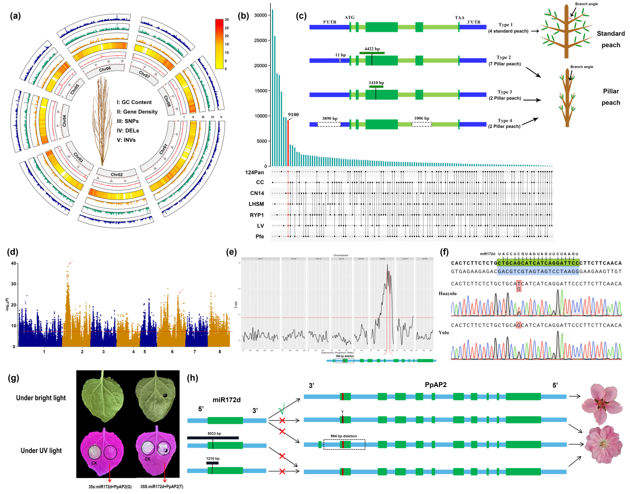 基于此,我们完成了首个gap-free桃参考基因组,进而利用多样本转录组数据对编码基因进行人工纠正,大幅提高基因注释的准确性,为桃功能基因研究提供准确的基因信息。结合比较基因组和转录组鉴定到PpTAC1变异是导致‘照手红’等柱型桃分枝角度小的关键原因。通过全基因组关联分析、混池测序等鉴定出miR172d和PpAP2共同调控桃单/重瓣花性状形成(图1)。青年教师张海朋博士和连晓东博士、博士研究生高帆和硕士研究生宋聪豪为论文共同第一作者,冯建灿教授和谭彬教授为共同通讯作者。