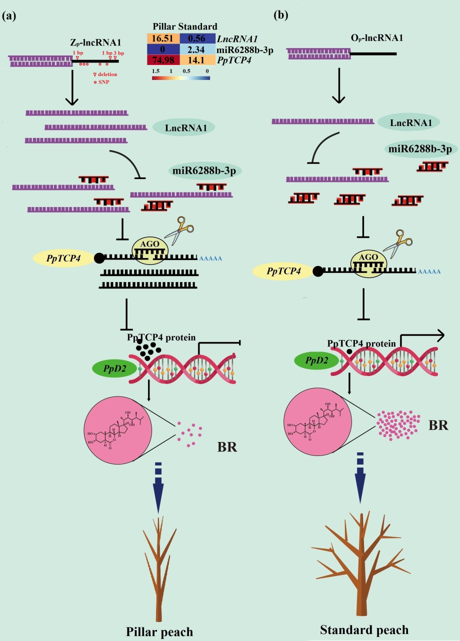 在前期高质量基因组和桃瞬时遗传转化体系构建的基础上,我们针对桃分枝形成相关基因进行功能验证,发现PpTCP4抑制发枝,而miR6288b-3p促进发枝。进一步分析发现柱型桃‘照手红’中lncRNA1启动子变异使其转录活性显著提高,高表达的lncRNA1通过竞争性结合miR6288b-3p的方式抑制miR6288b-3p对PpTCP4的剪切作用,而高表达PpTCP4抑制BR合成关键基因PpD2的表达来降低柱型桃内源BR含量。以上结果表明lncRNA1-miR6288b-3p-PpTCP4通过级联调控BR含量的方式影响分枝形成,即低浓度BR导致柱型桃发枝量少(图3a),高浓度BR则促进发枝(图3b)。青年教师王小贝博士、硕士研究生闫李霞和李天豪为论文共同第一作者,冯建灿教授和谭彬教授为通讯作者。