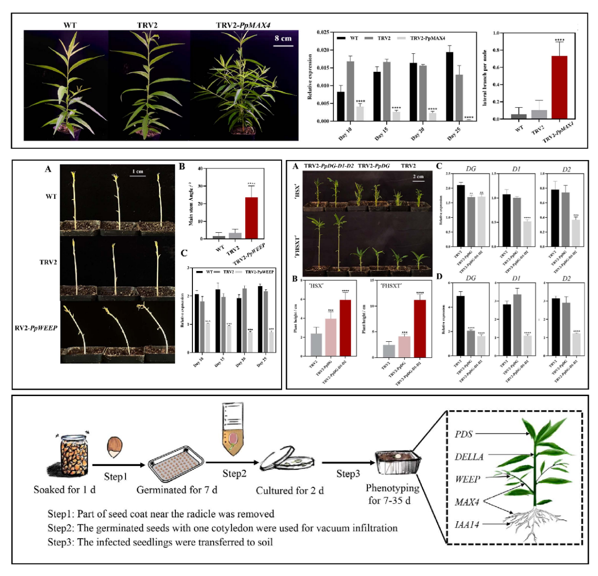 为解决目前桃遗传转化的难题,我们开发了一种桃瞬时遗传转化体系,明确了PpMAX4、PpWEEP、PpDGYLA和PpDELLA1/2基因在分枝、垂枝和株高中的作用。此外,过表达PpIAA14基因有效减少了桃苗侧根的形成(图2)。该方法为分析桃树生长发育相关基因功能提供了有力工具。糖心视频