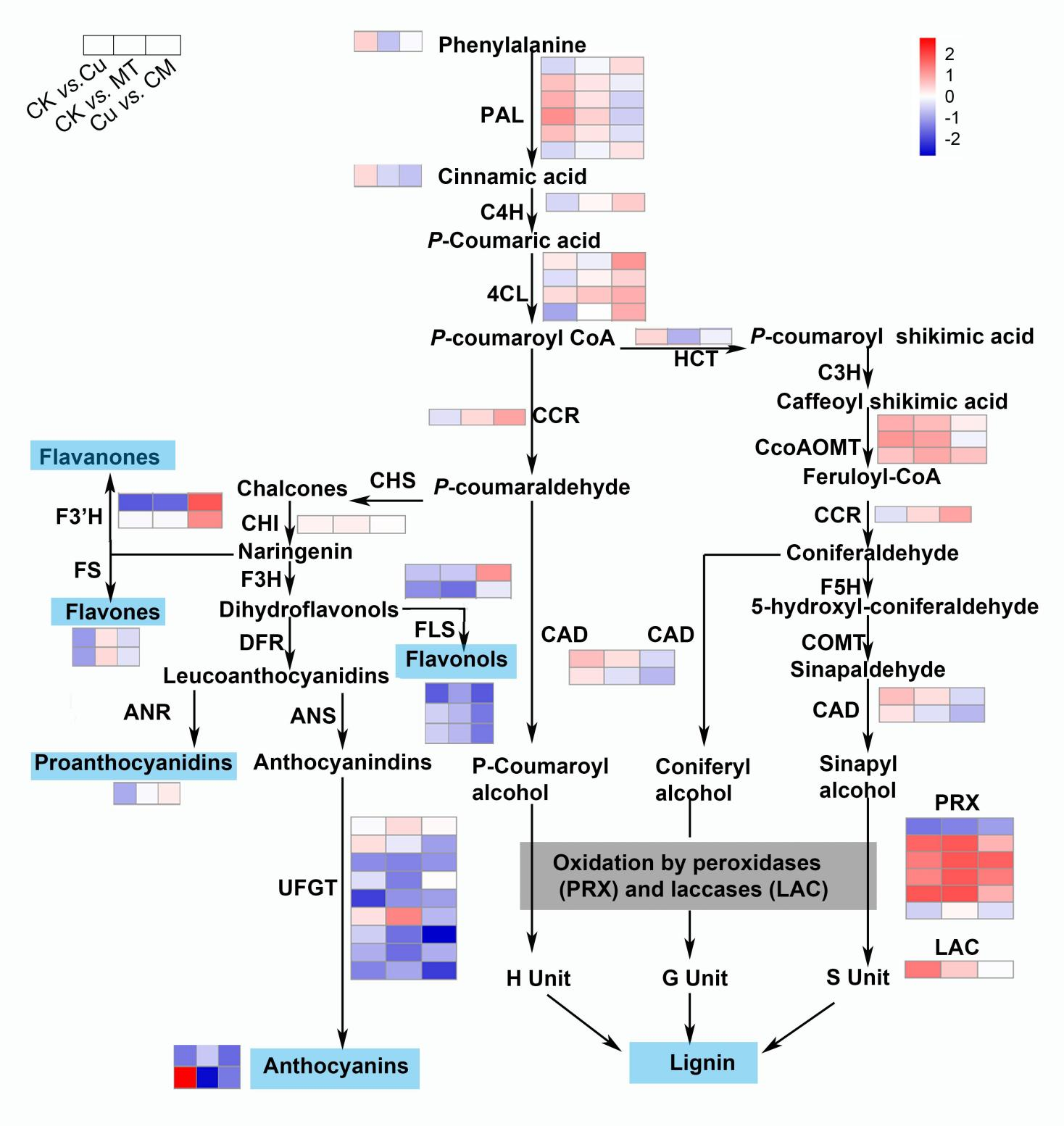 最新研究通过转录组和代谢组联合分析,详细阐述了褪黑素(MT)在番茄应对铜胁迫过程中的分子机制。研究发现,MT能增强与木质素合成相关基因的表达,使铜离子固定在细胞壁,减少其对细胞的损害。MT还能提高谷胱甘肽和氨基酸水平,诱导谷胱甘肽S-转移酶(GST)表达,增强对铜离子的螯合作用。此外,MT诱导热响应蛋白(HSPs)表达,促进黄酮和原花青素积累,有效保护细胞膜免受铜胁迫的损伤。MT还激活重金属转运蛋白,将金属-配体复合物转运到液泡中储存,进一步降低铜离子的毒性。