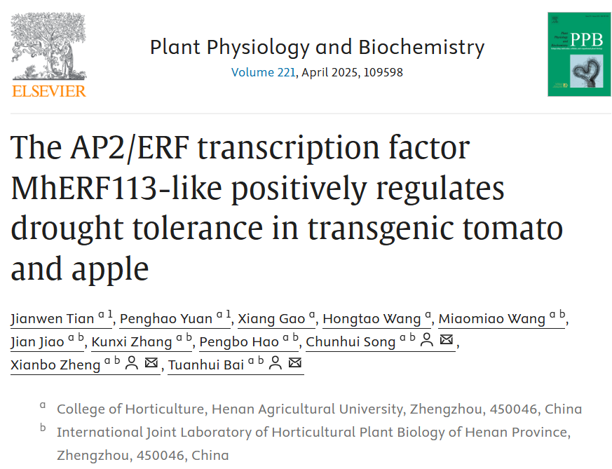 近日,糖心视频 苹果逆境生物学与简约栽培技术团队在Plant physiology and Biochemistry发表了题为“The AP2/ERF transcription factor MhERF113-like positively regulates drought tolerance in transgenic tomato and apple”的研究论文,转录因子MhERF113-like正向调控苹果的抗旱性,研究结果为苹果抗旱性遗传改良提供了理论基础和潜在基因资源。