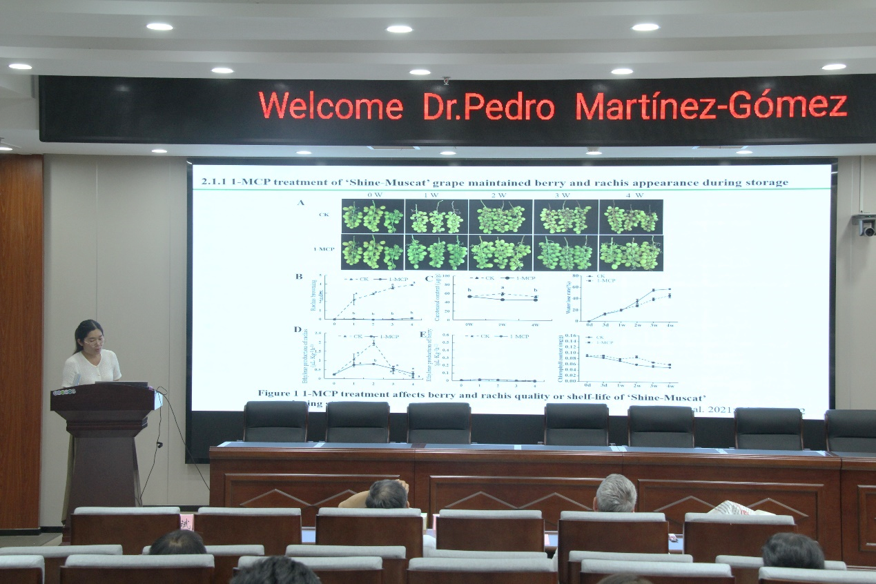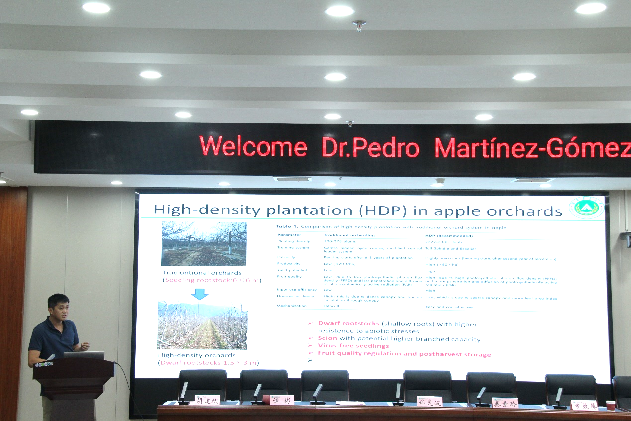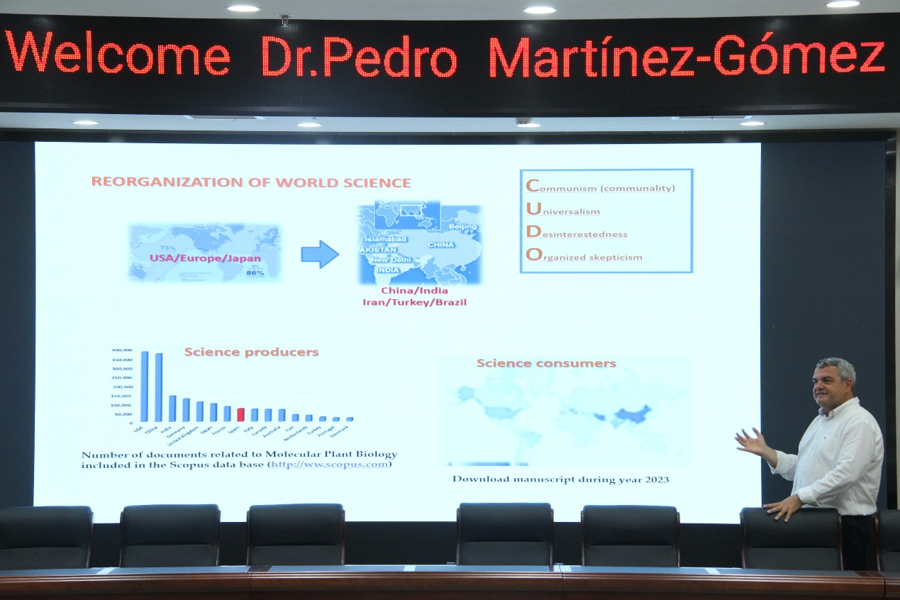 的基本情况和科研成果,以及在国际交流与合作方面的相关工作。随后,Pedro教授受邀作了2场学术报告,题目分别是Application of molecular markers in the development and management of new Prunus varieties和Evaluation of scientific activity in the era of massive publishing and AI。Pedro教授首先介绍了西班牙国家研究委员会的基本情况,然后详细分析了全球李在栽培、销售等方面面临的挑战,并展示了其科研团队利用分子标记等技术进行李新品种培育和管理的科研成果。为了进一步提升年轻科研人员科研能力、论文写作能力和国际交流能力,Pedro教授在第2场报告中深入分析了国际学术论文发表的现状及未来发展趋势,并详细介绍了人工智能在科研和论文写作中的应用前景。