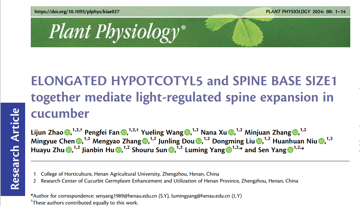 ELONGATED HYPOTCOTYL5 and SPINE BASE SIZE1 together mediate light-regulated spine expansion in cucumber”的研究论文。该研究揭示了黄瓜转录因子HY5和SBS1介导光信号调控果刺大小的新机制。