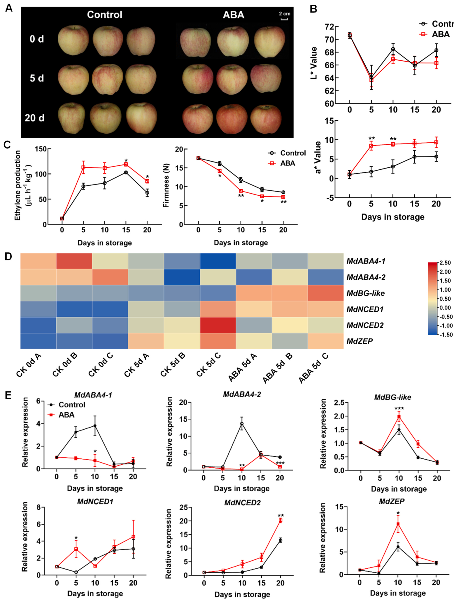 Fig. 1. The impact of abscisic acid treatment on postharvest ripening and softening of ‘Red Delicious’ apples.