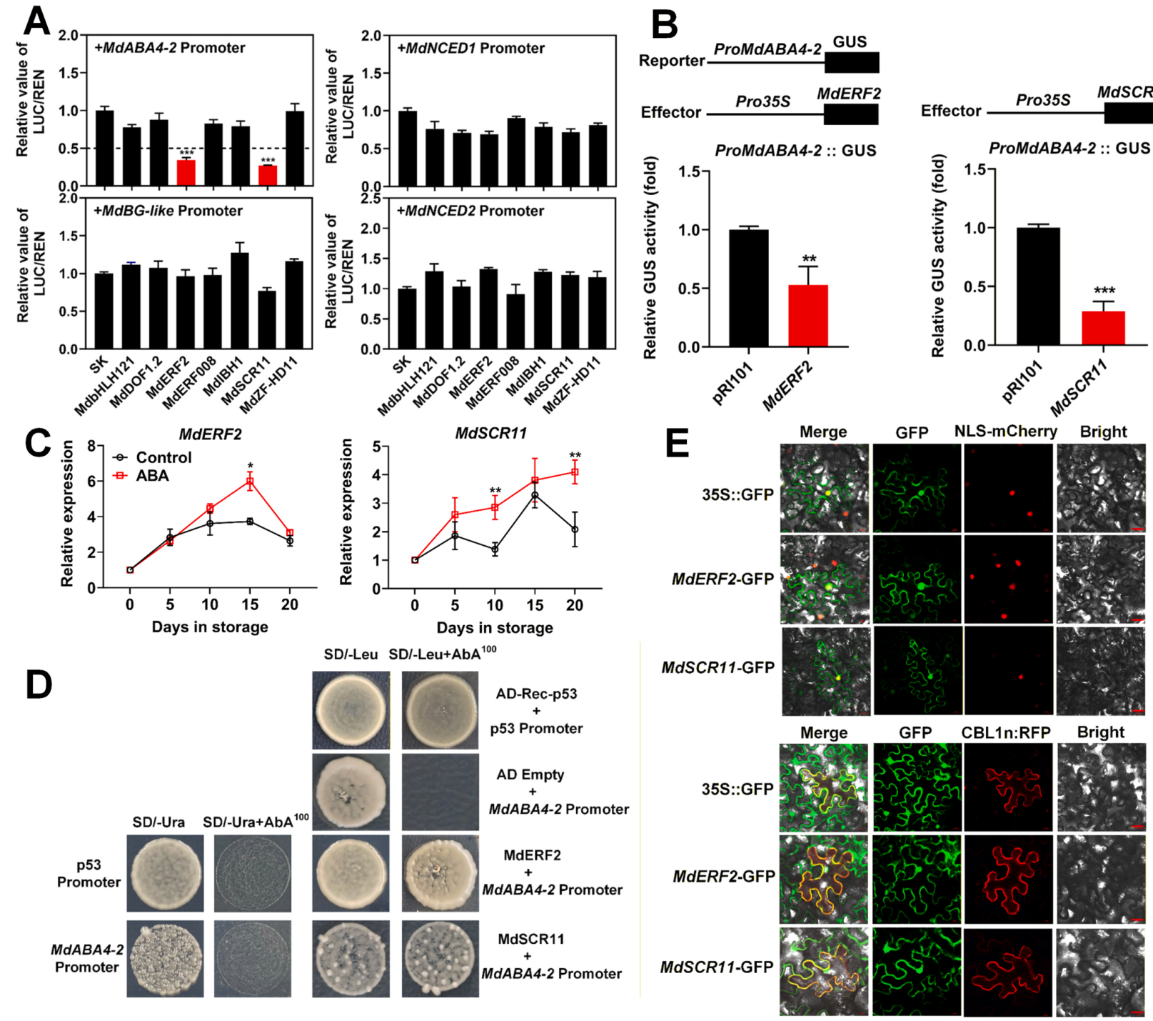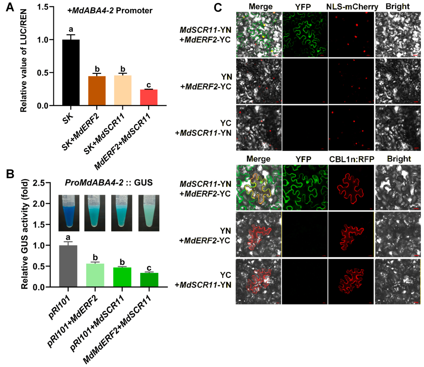研究人员利用LUC、GUS和Y1H等技术体系,发现ABA响应的转录因子MdERF2和MdSCR11能够直接结合并转录抑制ABA合成负相关基因
