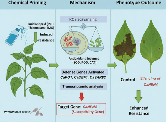 的茄科抗病抗逆与种质创新团队在国际知名植物病理学期刊《Molecular Plant Pathology》(中科院一区Top)上发表了题为“Chemical Priming by Neonicotinoids UnveilsCaNEN4as a Susceptibility Gene AgainstPhytophthora capsiciin Pepper”的研究论文。该研究首次阐明,常用新烟碱类杀虫剂吡虫啉(IMI)和噻虫嗪(TMX)不仅能防治害虫,还能通过激发植物自身的系统性免疫反应来增强辣椒对毁灭性病害——辣椒疫病(Phytophthora capsici)的抗性。尤为关键的是,研究团队鉴定出一个名为CaNEN4的辣椒感病基因,其功能丧失可显著增强抗病性,为培育广谱、持久抗病的辣椒新品种提供了全新的分子靶点。